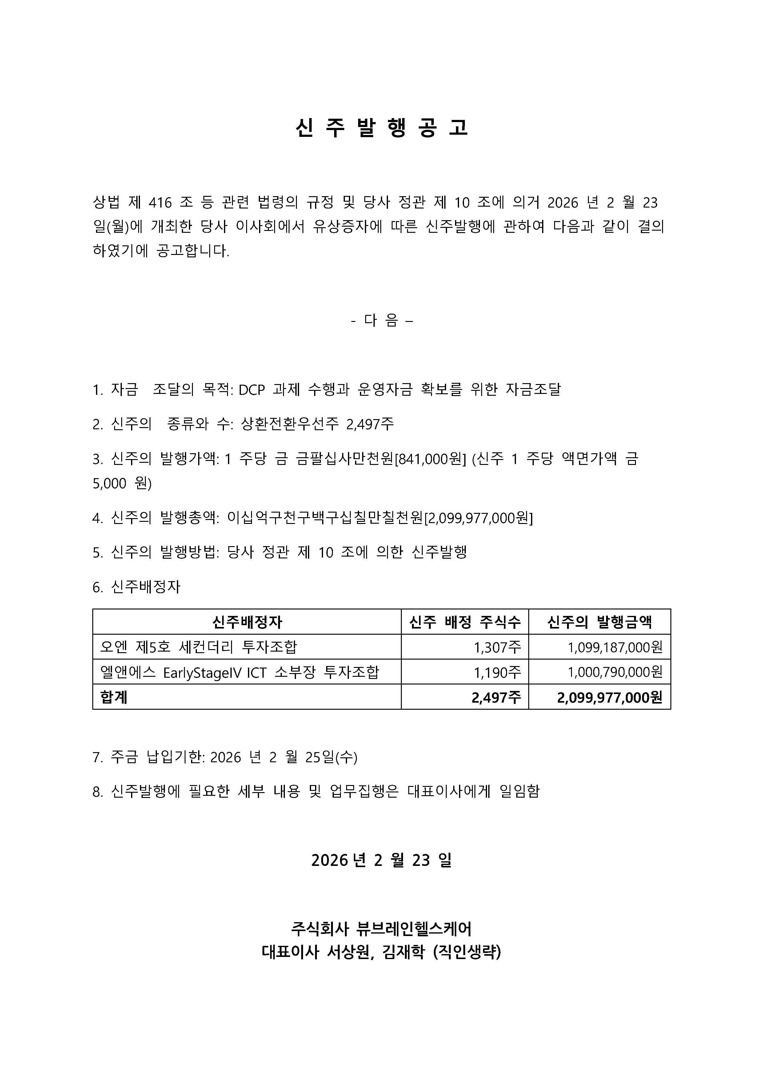 Notice 신규 발행 공고 작성자 beaubrain 작성일 2026-02-23 16:16 조회 53 인쇄 뷰브레인헬스케어-신주발행공고-20260223.pdf « 신주발행공고 목록보기 Powered by KBoard